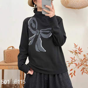 洋气百搭蝴蝶结印花2025秋季新款时尚半高领打底衫上衣女