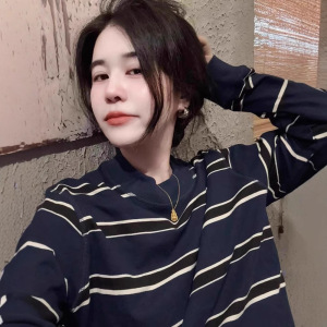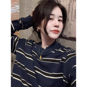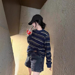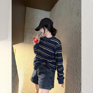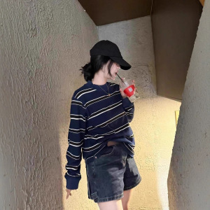 小个子藏蓝色条纹圆领无帽卫衣女秋冬季美式慵懒松弛宽松短款上衣