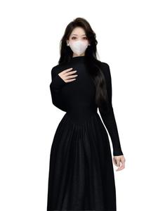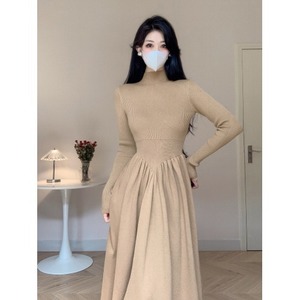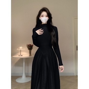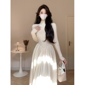 白色半高领长袖针织连衣裙女秋季配大衣内搭打底裙修身收腰长裙子