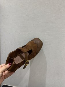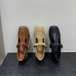 复古雕花方头浅口单鞋平底小皮鞋女小众设计法式玛丽珍鞋秋季女