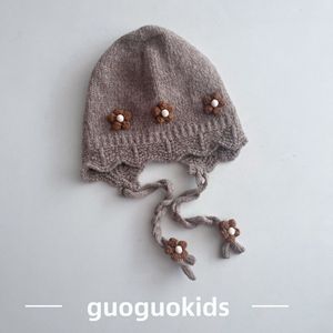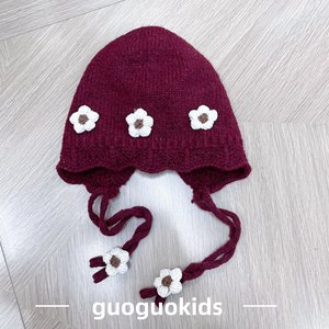 可爱花朵婴儿帽子针织帽 冬季女宝宝保暖系带毛线帽护耳帽批发