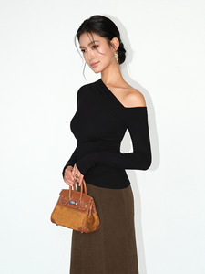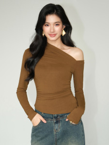 NEVA HU黑色斜领露肩针织T恤打底衫女设计感小众新款气质上衣