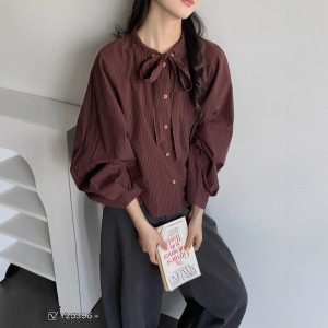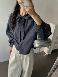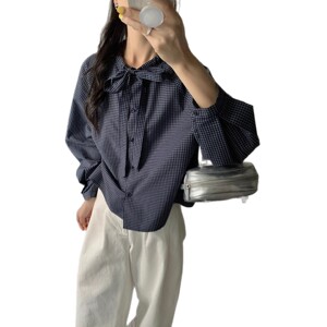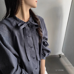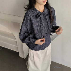 2025早秋新款韩版宽松显瘦百搭系带格子长袖衬衫女休闲上衣外套