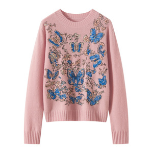 秋冬新款羊绒羊毛混纺针织衫女款重工刺绣蝴蝶提花秋冬新款打底衫
