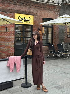 ZQ子晴 雾灰往事'撞色拼接绑带针织连衣裙女秋季设计感修身长裙