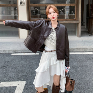 美拉德咖色立领皮衣外套女2025秋季新款小个子今年流行超火机车服