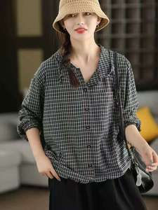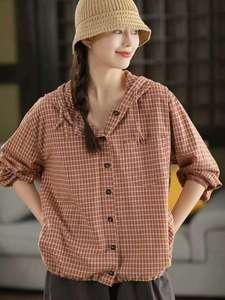 2025秋款复古文艺色织格子连帽衬衫女单排扣长袖宽松衬衣上衣