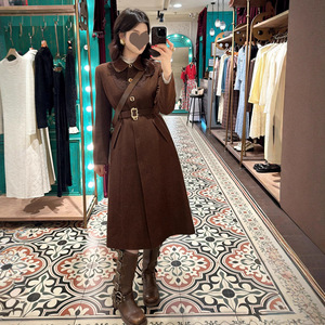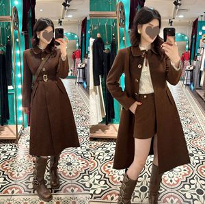 电影同款2025秋冬新款优雅翻领收腰咖色单排扣腰带长款毛呢大衣