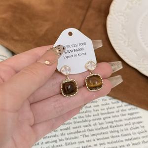 美拉德天然虎眼石耳环女小众设计感高级法式复古耳圈秋冬耳钉耳饰