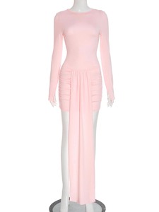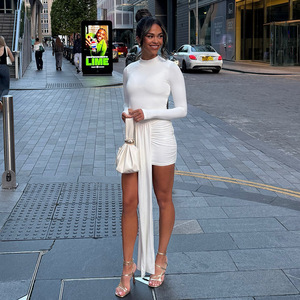 C25DS270欧美跨境女装秋冬新款气质纯色长袖垂坠飘带包臀短连衣裙