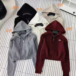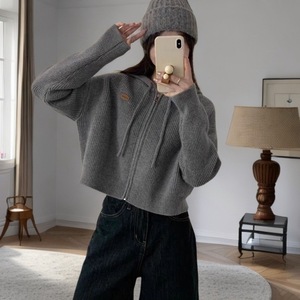 跨境2025秋冬新款拉链连帽系绳小个子短款针织开衫毛衣女休闲外套