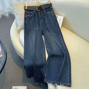 蓝色牛仔阔腿裤女2025新款秋季窄版高级感宽松显瘦高腰拖地直筒裤