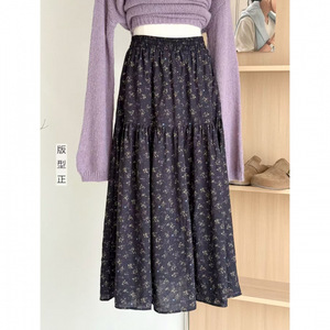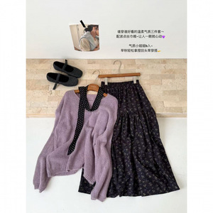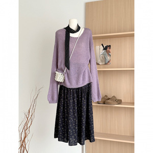 塞纳韩系慵懒风宽松长袖紫色毛衣女碎花连衣裙早秋穿搭套装配丝巾
