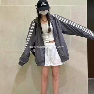 春秋款三叶女子套里三条纹运动休闲长袖立领夹克外套3360透气舒适