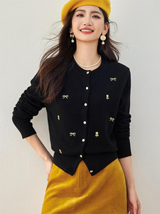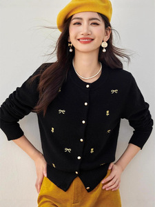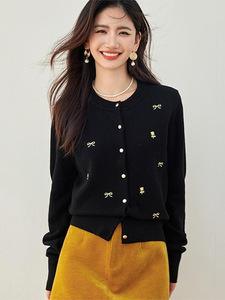 2025秋冬新款女装蝴蝶结花朵刺绣女士针织衫气质开衫外套女A7418