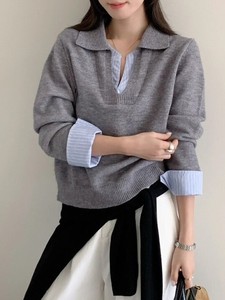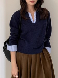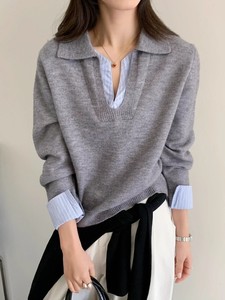 秋季2025韩新款时尚通勤设计感拼接条纹撞色假两件保暖毛衣