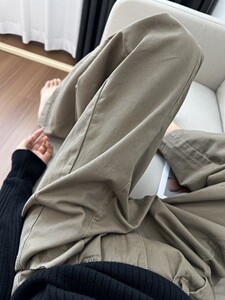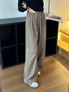 复古卡其色阔腿休闲裤女春秋季松紧腰宽松弯刀裤美式山本裤子