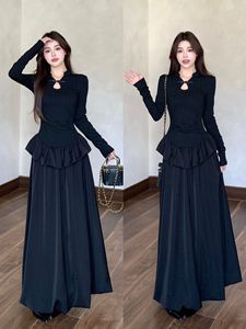 大码胖妹妹新中式立领盘扣长袖连衣裙女极简盘扣黑色长款蓬蓬裙女