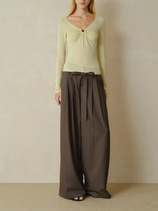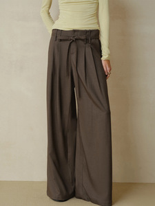 天丝羊毛无腰头双裤耳腰带双褶阔腿斜纹西裤
