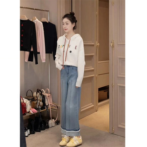 秋季温柔小香风穿搭女洋气小清新连帽针织上衣气质牛仔裤两件套装