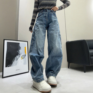 大码弯刀阔腿牛仔裤女秋冬2025新款梨型身材胖mm显瘦宽松直筒裤子