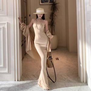 实拍!纯色吊带连衣裙女辣妹收腰显瘦包臀鱼尾长裙衬衣套装两件套
