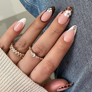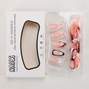 手工穿戴甲法式晕染花朵金珠中款杏仁型假指甲24片跨境穿戴式美甲