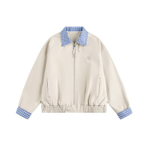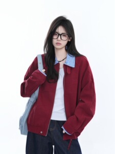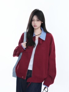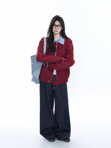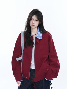 【坐吃山空】美式复古格子翻领红色工装夹克男女设计感宽松外套潮