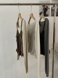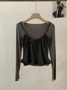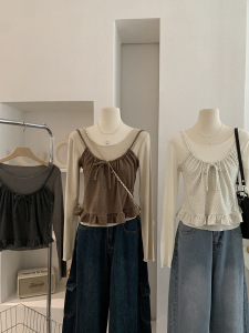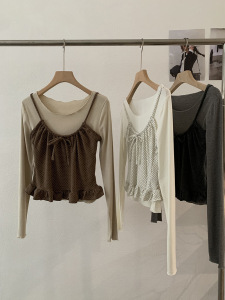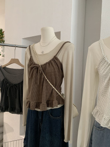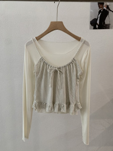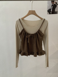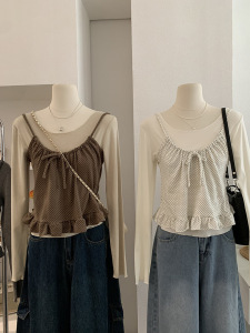 欧玛莱 波点吊带T恤两件套女秋季新款韩系木耳边长袖修身上衣4996