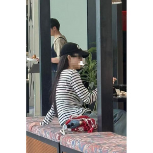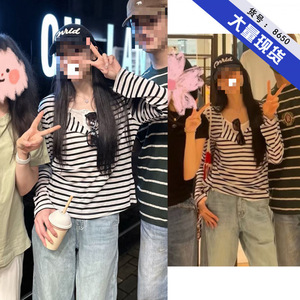 孙乐言同款假两件V领黑白条纹长袖T恤女早秋新款巨好看打底衫上衣