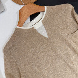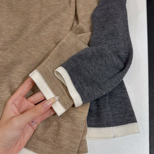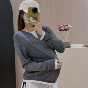 早秋新款假两件拼色套头圆领舒适长袖口袋宽松薄款羊毛针织上衣女