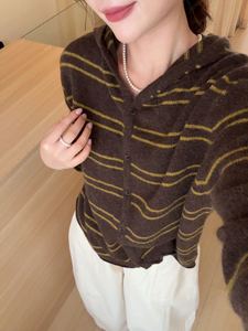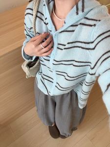之言25秋冬季女装羊毛衫韩系风时尚连帽条纹羊毛浣熊绒针织衫毛衣