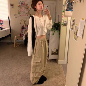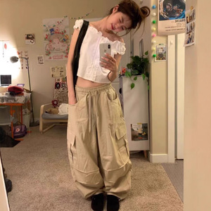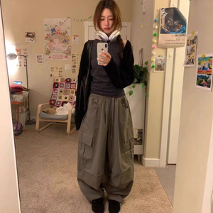 东大门ins韩版慵懒感复古工装大口袋街头宽松阔腿休闲长裤女春秋