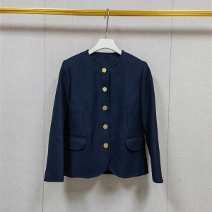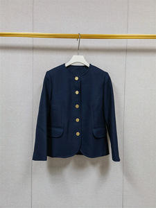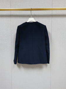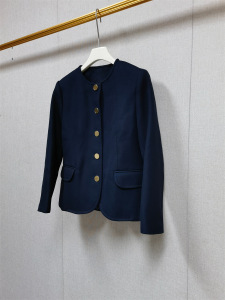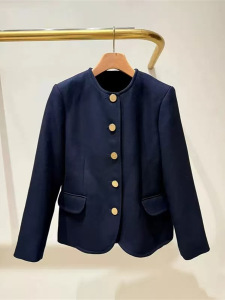 法式小众 2025秋冬新款深蓝正装圆领金属扣装饰直肩修身短外套