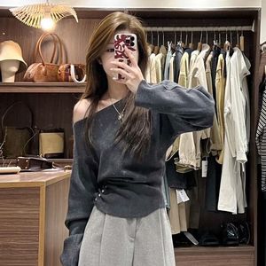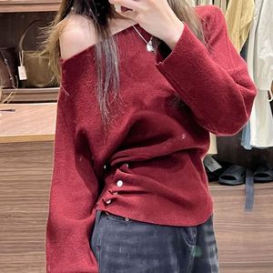 红色一字肩斜肩毛衣针织衫女新年设计感小众修身慵懒气质打底上衣