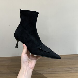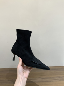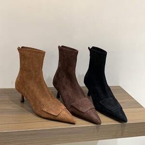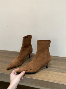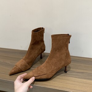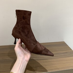尖头高跟绒面瘦瘦短靴女靴子2025春秋季棕色气质配裙子法式小裸靴