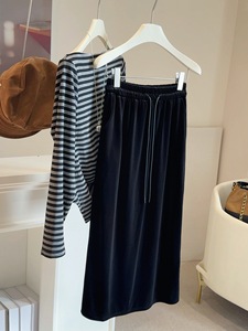 黑色金丝绒后开叉半身裙女秋冬新款松紧腰抽绳高腰显瘦中长直筒裙