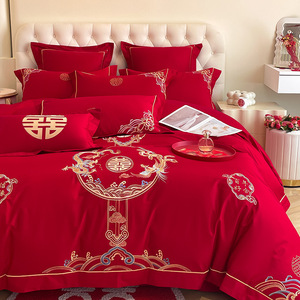 高档大红色婚庆四件套中式龙凤刺绣磨毛被套新房喜被结婚床上用品
