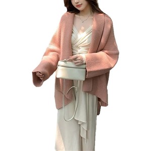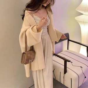 新款设计感咖色翻领落肩针织开衫宽松慵懒纯色外搭长袖毛衣外套女