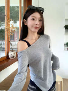 时髦韩系设计感撞色假两件斜肩毛衣女春秋气质宽松长袖针织上衣女