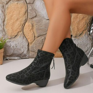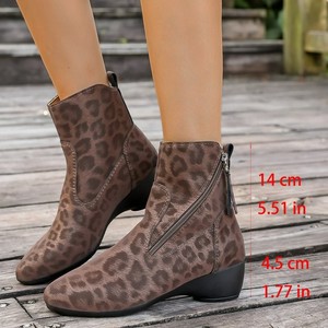 跨境大码2025秋冬季新款豹纹短靴侧拉链粗跟尖头欧美短筒女士靴子