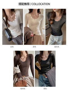 秋冬季德绒螺纹大圆领铆钉长袖t恤女款内搭修身打底衫可外穿上衣