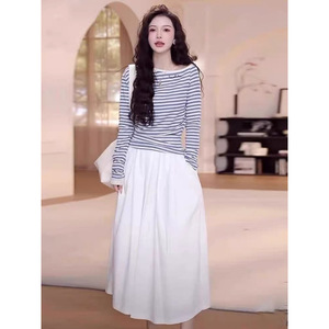 早春减龄小个子穿搭女2025年新款条纹上衣搭配休闲半身裙两件套装