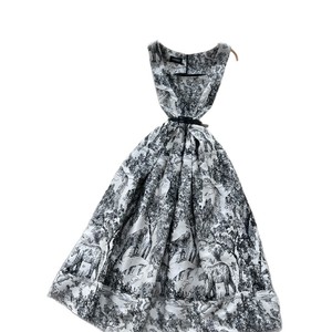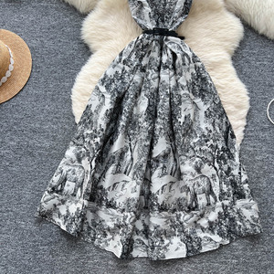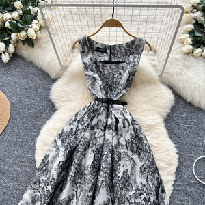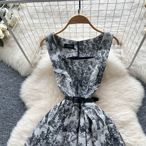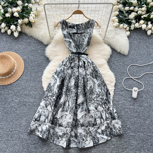 法式复古高端优雅方领无袖印花连衣裙女2025新款绑带收腰大摆长裙