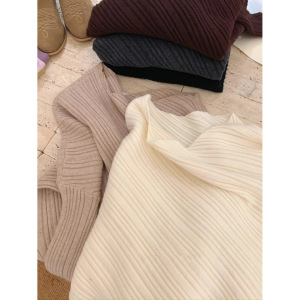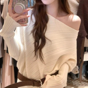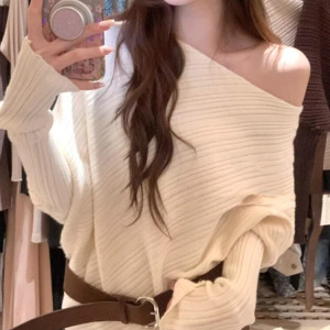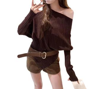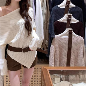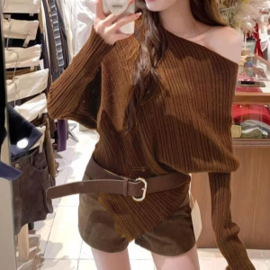 韩版不规则斜领露肩针织衫秋季气质宽松显瘦别致毛衣上