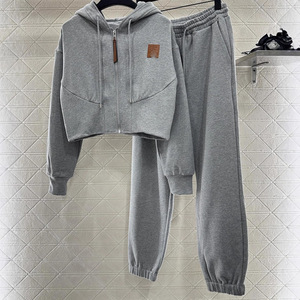 休闲运动风套装 纯色连帽短款卫衣外套+松紧腰长裤两件套 CT82863