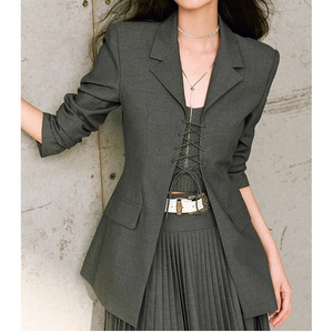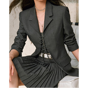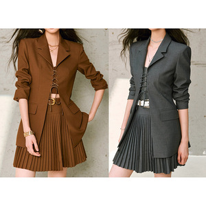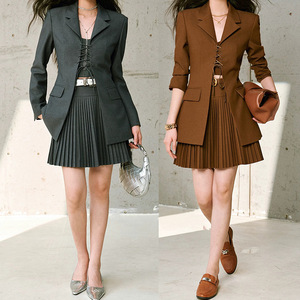 现货厂家批发 丝光感醋酸缎|绑带式收腰西装&百褶短裙老钱风套