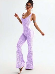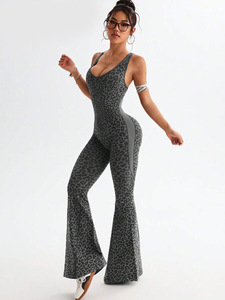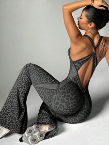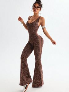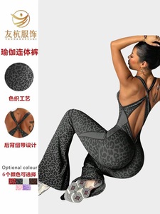 现货爆款单件交叉款肩带豹纹微喇连体裤后背扭结镂空背深V字形女