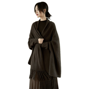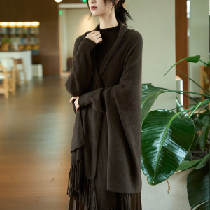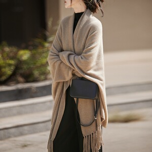 25年秋冬新款100%纯羊毛针织大披肩带袖女纯色流苏保暖斗篷上衣