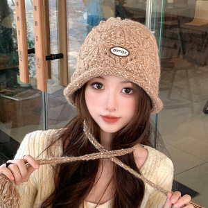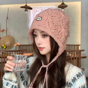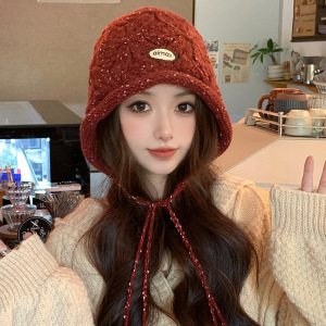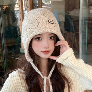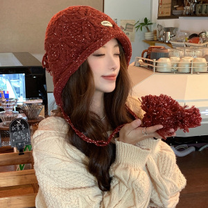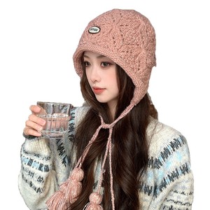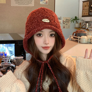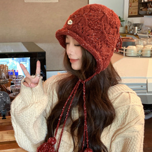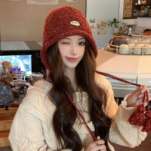 2025新款民族风针织帽子女秋冬套头帽保暖护耳冷帽流苏绑带毛线帽